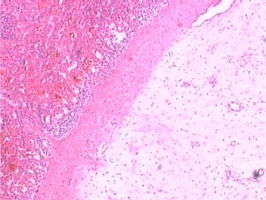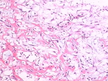 瘤细胞分化程度不一,细胞大部分轻度异型性,少部分呈中度异型性,核增大、深染,可见核分裂像(2-3个/10HPF)。间质可见胶原纤维,并局灶玻璃样变性,肿瘤细胞间有较多薄壁毛细血管,淋巴细胞和浆细胞浸润不明显,如下图4。