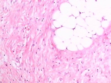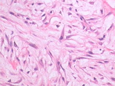 肿瘤细胞由梭形细胞构成,排列成束状、席纹状或片状,弥漫浸润至周围脂肪,如下图1。