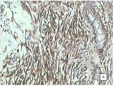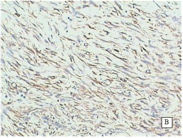 图5B actin在瘤组织中呈阳性表达(SP×100)